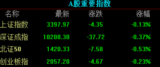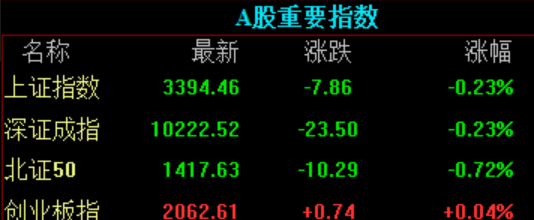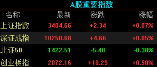 三大股指收盘涨跌不一,上证指数报收3402.66点,涨0.01%;深成指报收10234.33点,跌0.11%;创业板指报收2067.15点,涨0.26%。