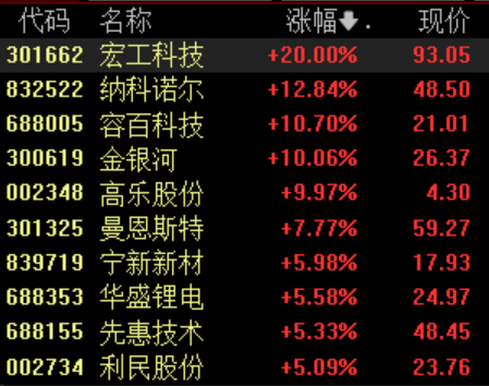 午后固态电池概念震荡回升,宏工科技、纳科诺尔涨超10%,金银河、容百科技、厦钨新能、海目星等跟涨。