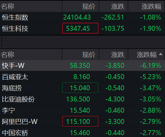 港股恒生指数日内跌超1%,恒生科技指数跌1.78%,小鹏汽车、快手跌6%,百威亚太跌超5%。