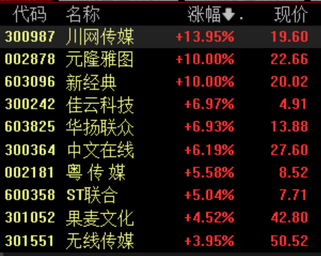文化传媒板块走高,元隆雅图、新经典涨停,川网传媒涨超13%,中文在线、视觉中国、掌阅科技、卓创资讯、人民网等跟涨。
